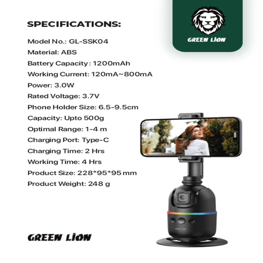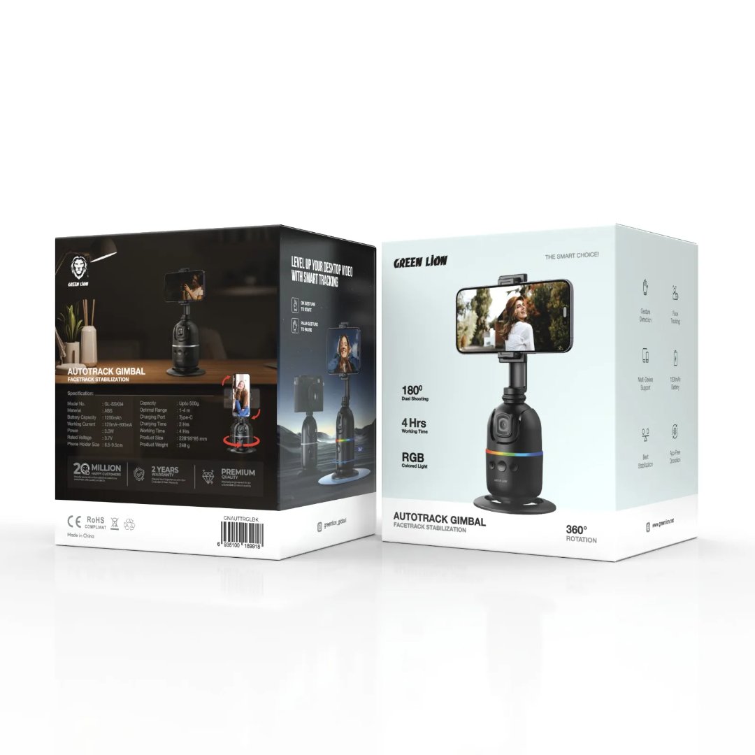 The Green Lion AutoTrack Gimbal provides exceptional smoothing for your phone thanks to its advanced stabilization mechanism, allowing for professional-level footage. Constructed with durable ABS material, it features a 1200mAh battery that can support up to 4 hours of continuous work. The optimized structure of the gimbal supports phones with holders ranging in size from 6.5 to 9.5 cm and can carry up to 500g for various devices. Whether capturing face tracking or utilizing gesture detection, the AutoTrack Gimbal elevates your filming experience. With 360° rotation and 180° dual shooting modes, it allows for versatile angles and movements. The app-free operation makes setup hassle-free, while the RGB-colored light adds a creative flair to your shots. The gimbal fully charges fast-charging via Type-C in 2 hours, ensuring you’re always ready to shoot. This ranges between 1-4 meters; hence, it is the ideal tool for capturing dynamic, stable videos.
