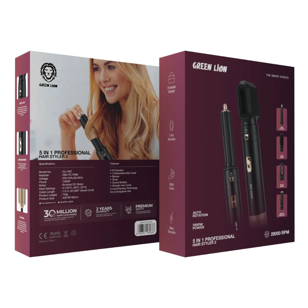 The Green Lion 5 in 1 Professional Hair Styler 2 is the best to provide salon-level styling of hair from home. The product has a 1000W Brushed DC motor to deliver excellent performance with 28000 RPM to style efficiently. The 3-level heat technology offers variable temperature levels (105°C, 80°C, 55°C) that can be suited to all types of hair. With 5 air nozzles, it provides styling versatility, from drying to straightening, with ease of use and flexibility coming from the 1.8m UK swivel cord. Being light and compact, it is easily portable and stowable, with easy care giving easy maintenance to the natural shine of your hair. Its auto-rotation feature provides convenience in terms of ease of operation and silky smooth finish. Made of durable ABS, PC, and PA66, this hair styler is built to last and deliver silky smooth results every time. Perfect for professional-level styling without the cost of the salon.
