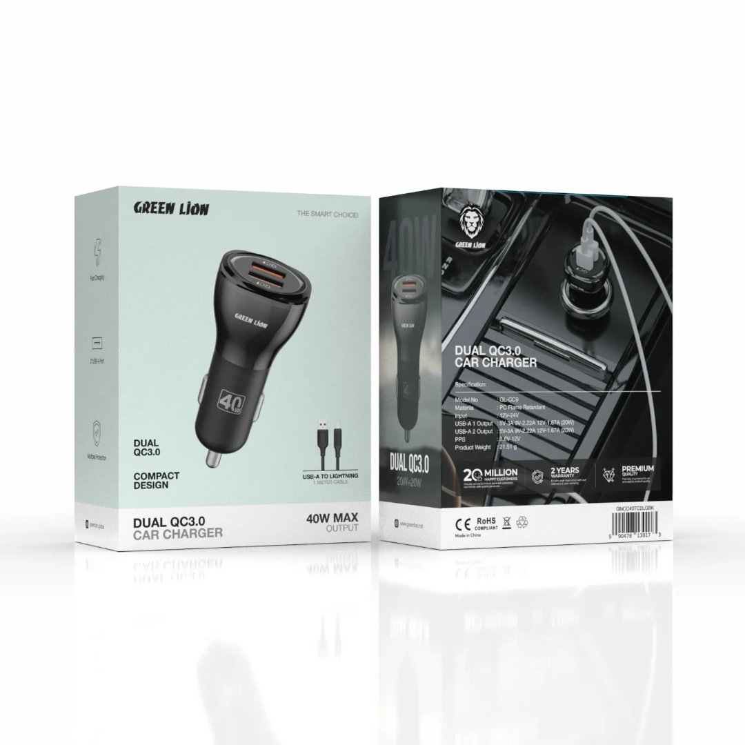 The Green Lion Dual Port Car Charger 50W is perfect for all driving enthusiasts as it quickly and efficiently charges electronic devices while on the move. It has a PC flame-retardant construction. The input voltage is 12-24V, making it highly compatible with most cars. In one compact device, you get two ports up to 30W PD charging (5V/3A, 9V/2.78A, 12V/2.5A) through a USB-C output and 20W QC charging (5V/3A, 9V/2.22A, 12V/1.67A) through a USB-A output. Its dynamic power adjustment allows it to be popular for fast charging of various devices, from smartphones to tablets. Features include PPS technology (3.6-12V). In addition, this product includes a free 1m C to C / C to L cable for easy access and use. Enjoy fast dual-port charging and travel convenience with the Green Lion Dual Port Car Charger 50W, your perfect companion on your power adventures.