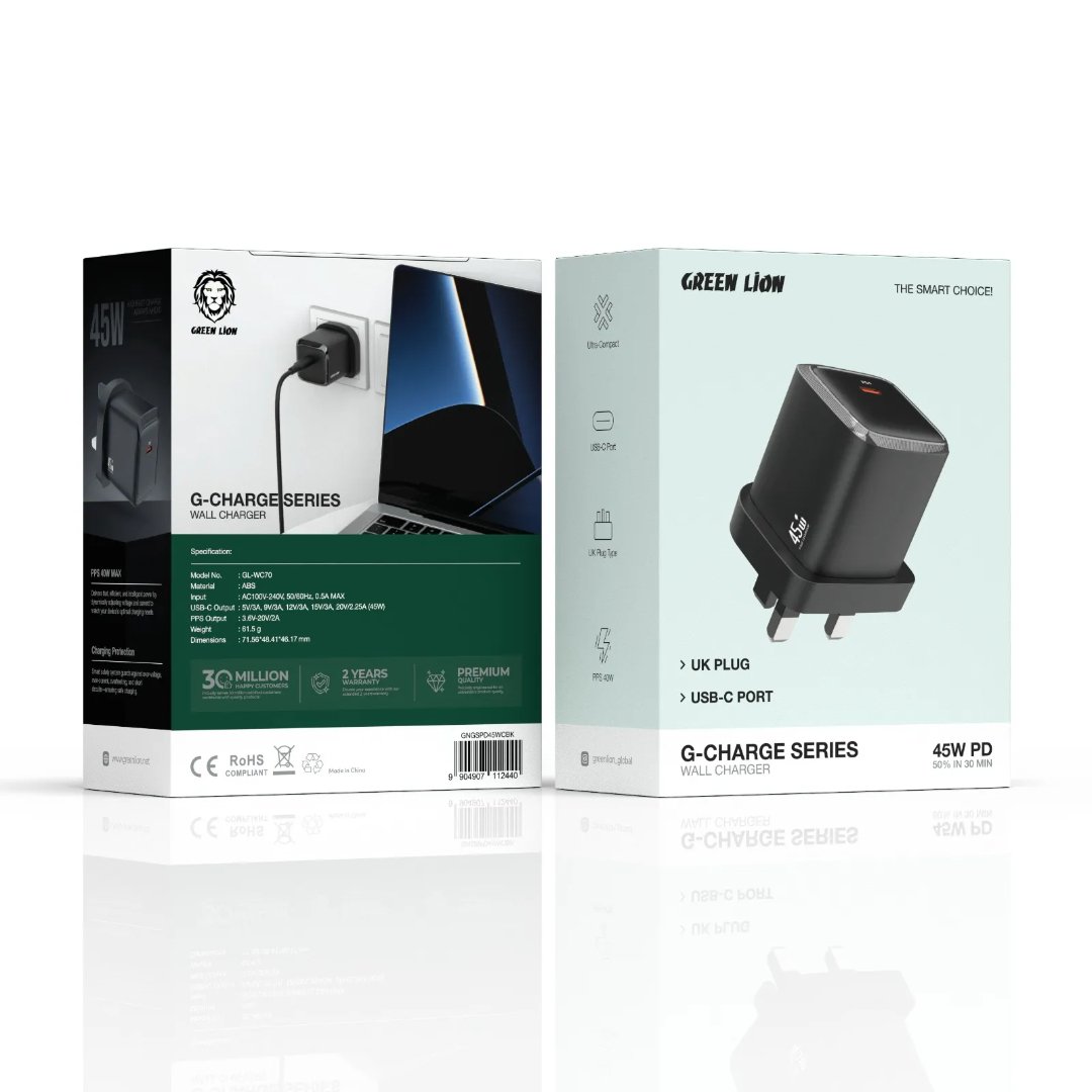 The Green Lion G-Charge Series 45W PD Wall Charger is the ultimate fast and efficient charger for your devices. For a smartphone, tablet, or laptop (and any USB-C device), this charger with its quick 45W PD charging feature will have it all done in no time. The USB-C port guarantees that the charger can be used with the latest appliances without any difficulty, while the UK plug is most suitable for the UK and other countries where the plug is the same. Overcharge protection is a safety feature that takes care of your devices during charging, thus giving you peace of mind. Its small size and light weight mean you can carry it around on your travels or store it at home or in the office with ease. The design that is friendly to the environment ensures that the charger is very reliable because it uses energy very efficiently. Green Lion 45W PD Wall Charger is now the great answer to all your charging needs, regardless of whether you need to charge your phone or laptop.
