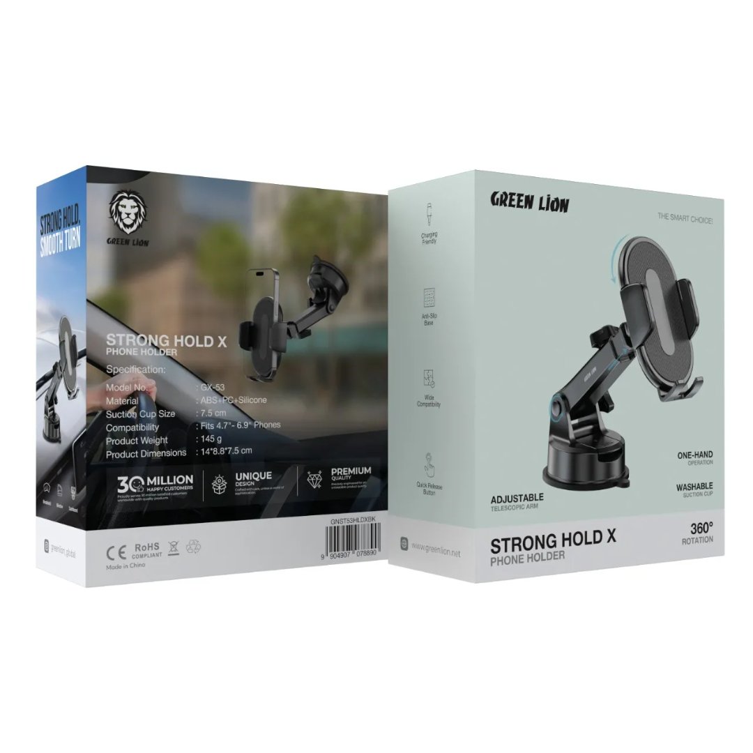 The Green Lion Strong Hold X Phone Holder is a very firm and adaptable way to mount your phone in the car. Its construction materials are ABS, PC, and silicone, which are very strong, and as a result, the holder is ready for daily use. The suction cup of 7.5 cm grips the windshield or dashboard very strongly and has the quality of being washable, thus, it is very usable in the long term. The telescopic arm that can be adjusted lets you slide the phone into the greatest position, and the 360° rotation allows you to alternate easily between portrait and landscape views. The anti-slip base ensures that the holder is not going to be dislodged even if there are bumpy roads, and the quick-release button is for easy one-handed operation. This holder is compatible with four and four-and-a-half half to six-and-a-half-inch phones and is also charging-friendly, that is, you will be able to power your device while on the go. Green Lion Strong Hold X Phone Holder is definitely a driver’s best friend with its convenience and user-friendly design.