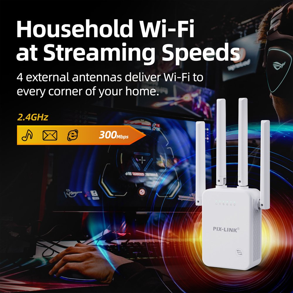 Compact, stylish, and easy to install, the PIX-LINK N300 is the perfect solution to eliminate WiFi dead zones and enjoy fast, stable connectivity anywhere in your space.